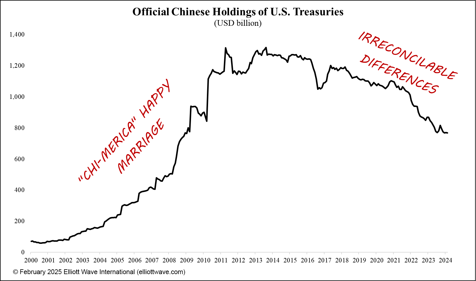 Nell'ultimo decennio le disponibilità ufficiali cinesi di titoli del Tesoro americano sono diminuite notevolmente, poiché la coppia, un tempo felicemente sposata, si è resa conto di avere differenze inconciliabili. Con l'attuale amministrazione statunitense che sta mettendo a repentaglio le relazioni internazionali, gli investimenti esteri in titoli del Tesoro americano potrebbero diminuire ulteriormente. Ciò aumenta la probabilità che, a un certo punto, si verifichi un incidente nel mercato dei titoli del Tesoro. Teniamo d'occhio le aste di obbligazioni, frequenti e di grandi dimensioni, per individuare eventuali segnali di calo della domanda.