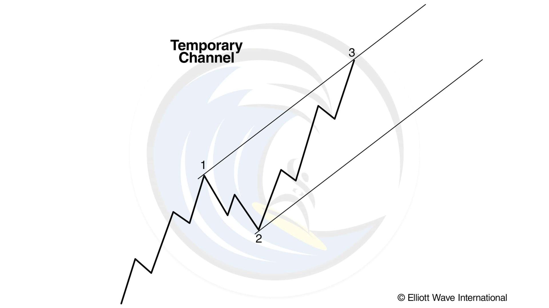 The initial channeling technique for an impulse requires at least three reference points. When wave three ends, connect the points labeled 1 and 3, then draw a parallel line touching the point labeled 2, as shown below.