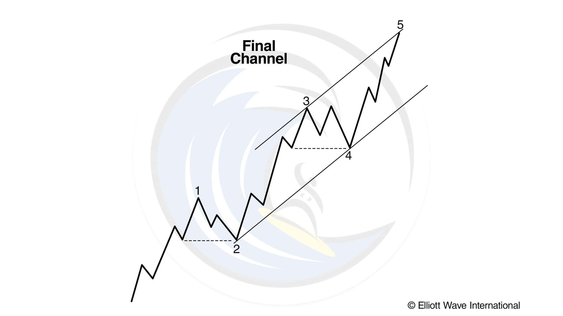 A properly drawn channel typically marks the upper and lower boundaries of an impulse wave (a five-wave move in the direction of the trend). Elliott channels are most useful in identifying targets for wave four and five.