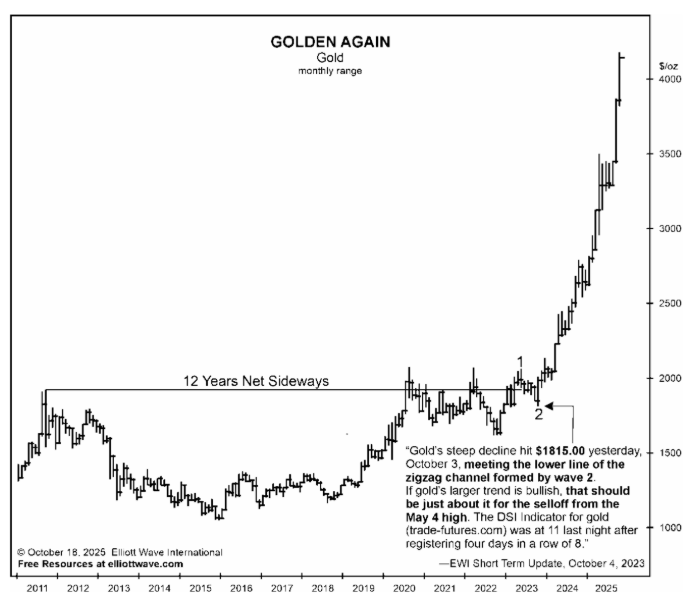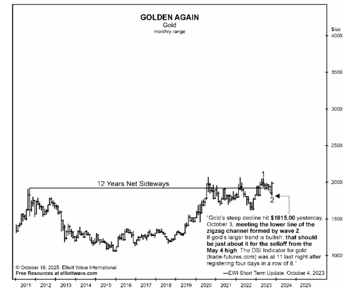 On September 29, 2023, after 12 years of net sideways movement in gold, our Elliott Wave Financial Forecast focused subscribers on the “approaching wave 2 low”-- which meant a powerful wave 3 rally was about to begin.