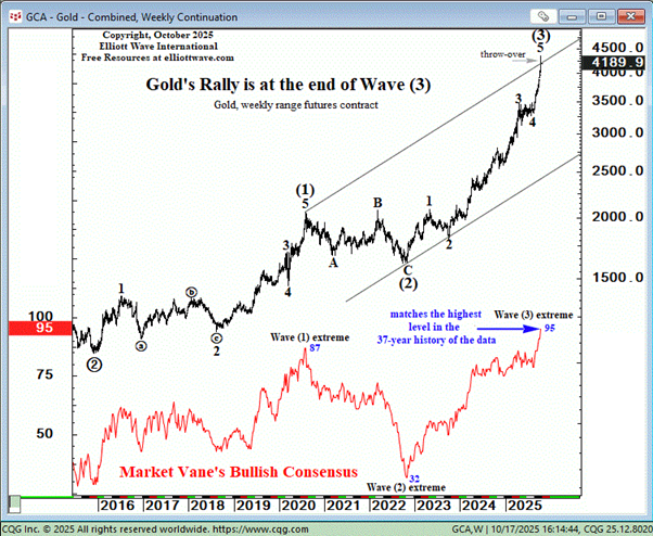 We remained patiently bullish for two long years until October 17, 2025 when our Short Term Update stated unequivocally, “Gold’s Rally is at the end of Wave (3).” |